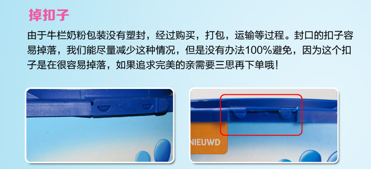 注意:牛栏,美素奶粉包装为纸桶/纸盒,(不像日本奶粉是铁皮罐装)并且里面的锡箔密封膜容易爆开,所以难免会出现憋罐或者爆听的情况。虽然几率不大,但毕竟是存在的,为了让大家有个愉快完美的网购过程,小雪就多啰嗦一下。我们一直很用心很用心包装,发货前也一定仔细检查。但即使这样,也不能保证您签收时100%完好,万一憋罐或爆听,也请理解并签收。奶粉开罐后一个月内吃完都可以的,请放心食用!请介意憋罐或者爆听的买家千万不要拍!憋罐或者爆听均不退不换不赔,因此原因给本店中差评的,请您一定一定绕行,因为小雪将信誉看的比什么都重要!这并不是霸王条款,是因为荷兰美素和牛拦奶粉包装的特殊性,如果实在担心奶粉瘪罐爆听,同城购买建议到店自提,外省市买家建议购买2元气囊包装,以降低奶粉爆罐风险,谢谢大家的理解和支持!
