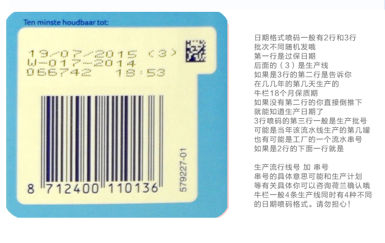 生产许可证编号: 产品标准号: 厂名:www.nurtriciavoorjou.nl 厂址:nutrica kindervoeding service antwoordnummer10061 厂家联系方式:0000000000000000000000 配料表:能量 酪蛋白 乳清蛋白 饱和脂肪 皮式脂肪 单元不饱和脂肪 亚麻油酸 亚麻酸 储藏方法:避光...