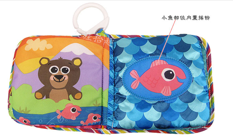 介绍:鲜艳的颜色刺激宝宝视觉发育,有趣的声音唤醒听觉意识,布书配有一个可以携带的拉环,可以挂在宝宝车或宝宝床上,也方便宝宝外出带着看。封面封底都带有响纸,声音清脆,小熊肚子还有一个BB器哦。库存尾货,可能有一点仓库的味道,请清洗后给宝宝玩耍。材料绝对安全,请放心。