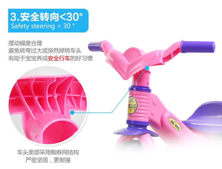 答:宝宝处于训练平衡时期,如果转向过大,车头一下子大幅度转弯,宝宝容易失去平衡。保宝窝平衡训练三轮车,车头转向小于30°,有助于宝宝养成安全行车的好习惯。(妈妈们在为宝宝选购车子时,要特别注意车头转向问题哦!)