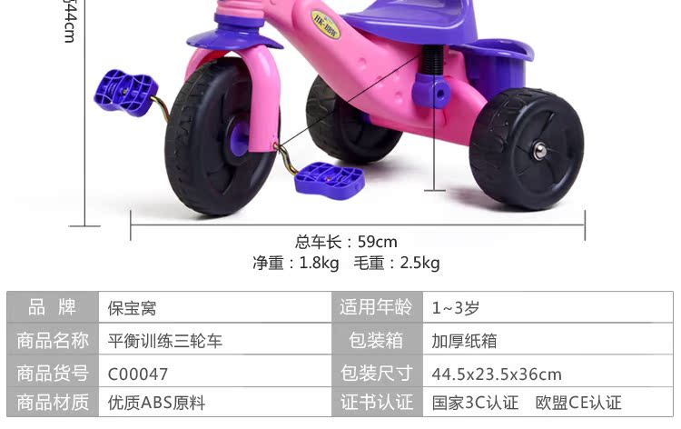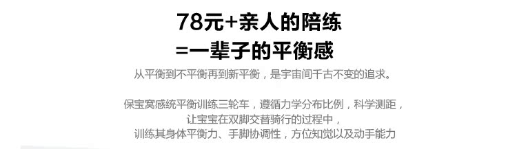 答:宝宝刚接触新的三轮车,需要小段时间的训练过程。(如同我们穿高跟鞋,脚与新鞋需要小段时间适应,是一样的道理哦!~)保宝窝平衡训练三轮车,让宝宝在不断调整平衡的过程中,感觉系统得到很好的训练,平衡能力取得飞跃性提高。