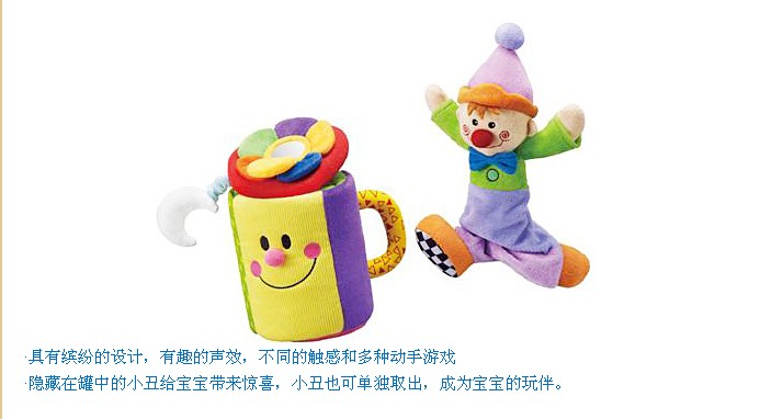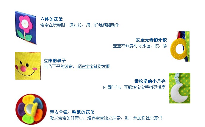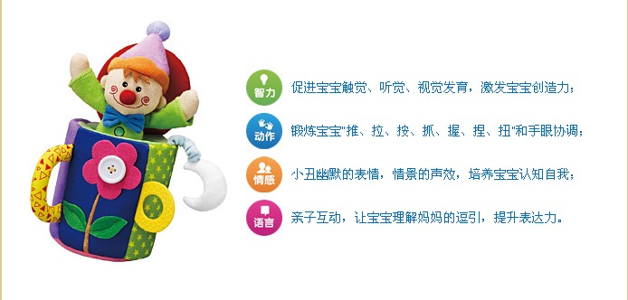【产品描述】多种玩法多种用途,带安全镜、响纸、牙胶、BB叫等,立体花朵和鼻子,独立小丑藏在其中,促进宝宝视觉、听觉、触觉发育。