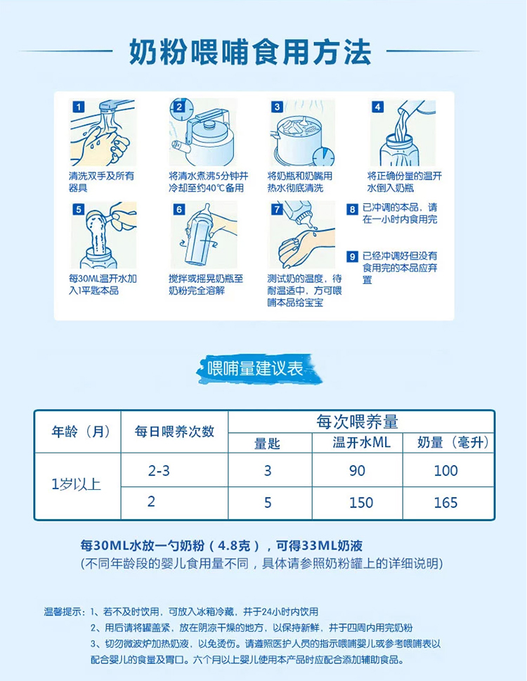 奶粉选用优质的原料奶粉,严格按照国际先进的生产工艺流程。采用全封闭净化和自动化生产,确保产品的营养健康和安全。