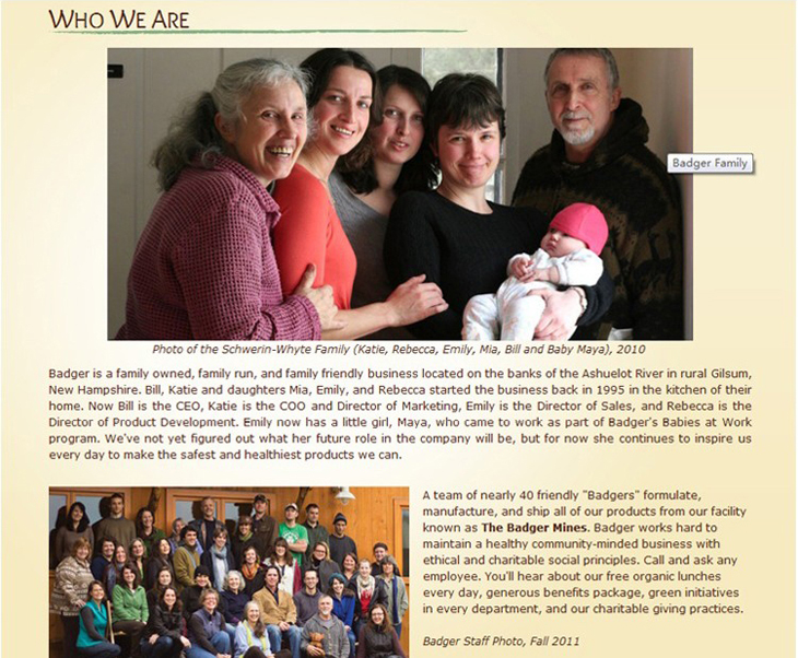 比尔怀特先生的第一种天然草本软膏,是由天然蜂蜡、精制橄榄油、蓖麻油以及特选精油所调制而成,是他用来舒缓干燥与干裂的双手的独家秘方,这个配方最初是用来让自己的手部可以舒服一点,毕竟一整天的木工工作实在是相当的伤手,由于经不起周遭的朋友一再央求,因此他决定开始贩售这些软膏。由这项Badger经典手部修护霜(Healing Balm)开始,怀特先生投入许多精力继续开发各种多用途的天然草本软膏,于是,草本防蚊膏(Anti-bug Balm)、柠檬油指甲修护膏(Cuticle Care)、脚跟龟裂膏( Foot Balm)、巴里度假膏(Bali Balm)、薰衣草助眠膏(Sleep Balm)以及放轻松软膏(Sore Muscle Balm)也相继诞生。