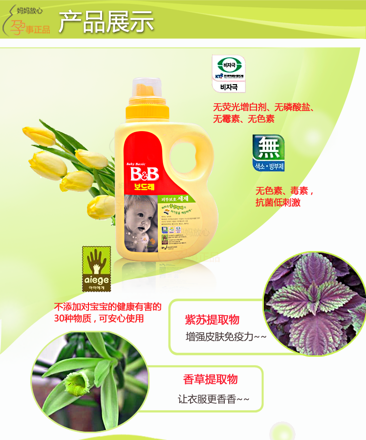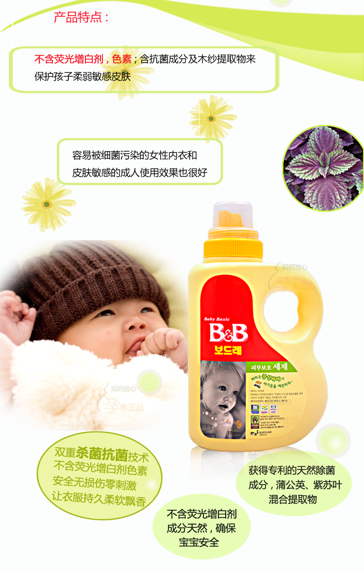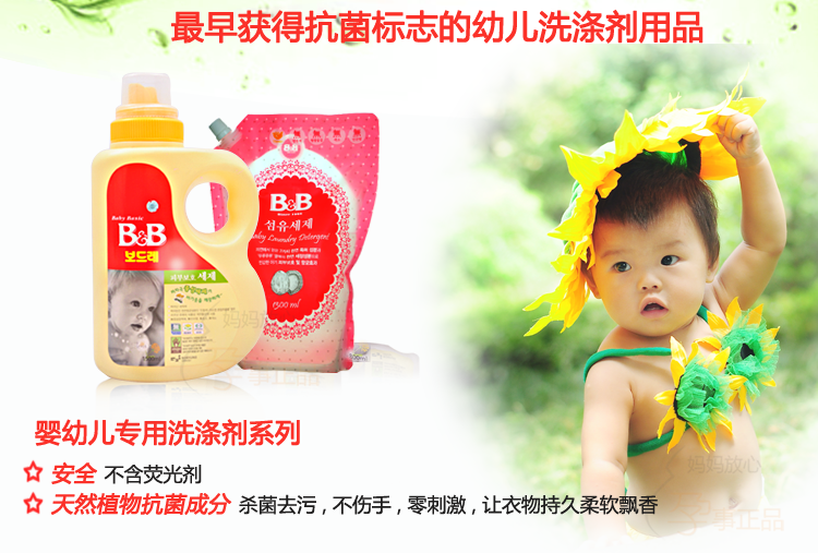 ·韩国幼儿衣类专用洗涤剂中最早得到S抗菌标志的幼儿纤维洗涤剂用品。