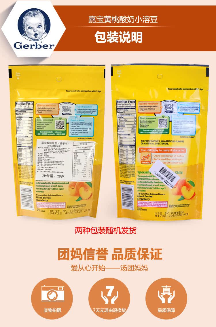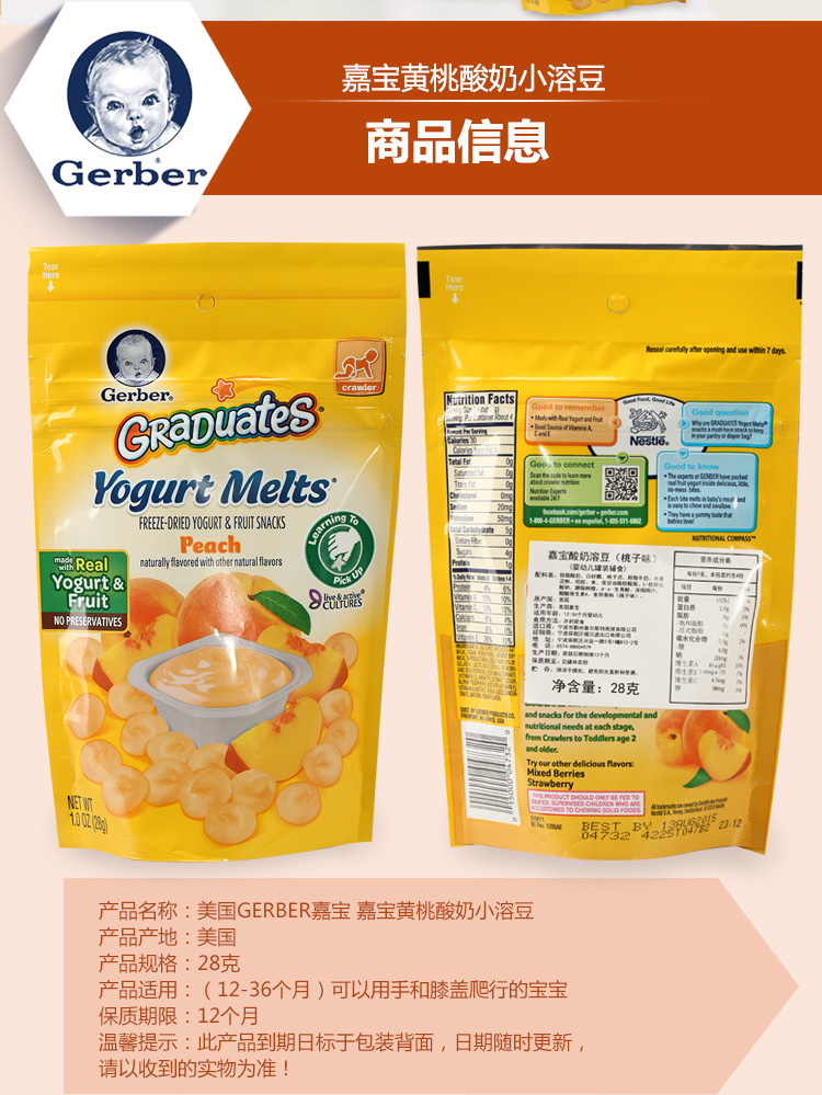 生产许可证编号: 产品标准号: 厂名:美国 嘉宝 厂址:美国 厂家联系方式:1-800-443-7237 配料表:见配方表 储藏方法:阴凉干燥处,开封后1周内食用完 保质期:365 食品添加剂:无食品添加剂 包装方式:包装 品牌:Gerber/嘉宝 系列:溶溶豆 包装种类:罐装 产地:其他...