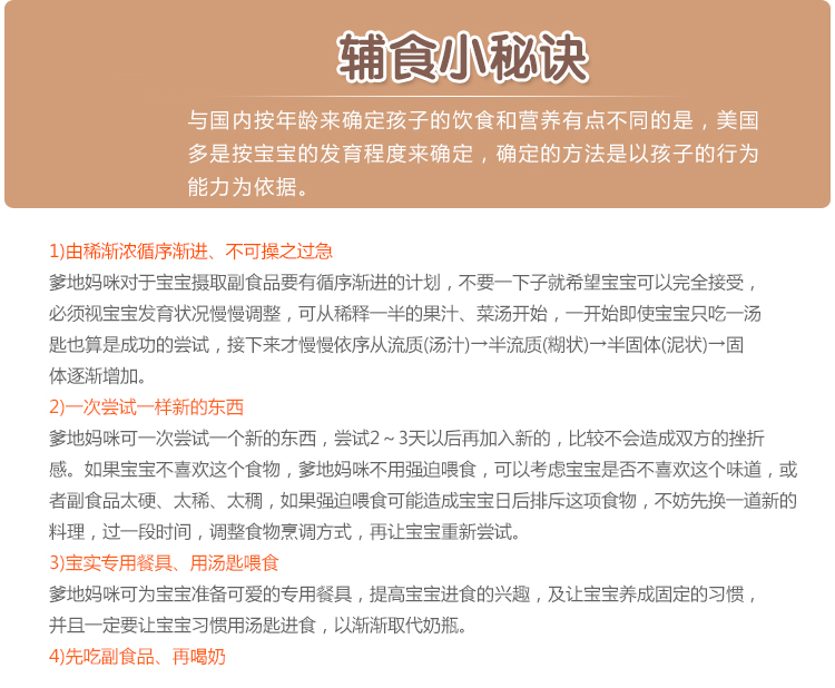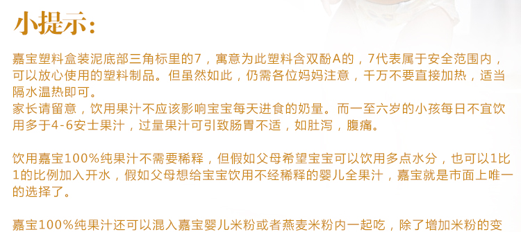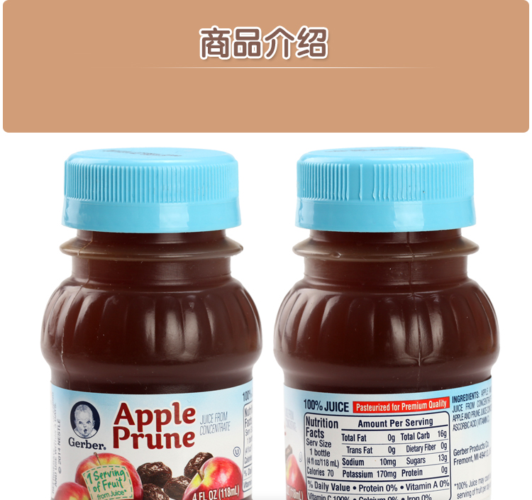 生产许可证编号: 产品标准号: 厂名:美国 嘉宝 厂址:美国 厂家联系方式:1-800-443-7237 配料表:见配方表 储藏方法:阴凉处储存 保质期:456 食品添加剂:无食品添加剂 包装方式:包装 品牌:Gerber/嘉宝 货号:苹果西梅汁 包装种类:罐装 适用年龄:6个月以上 产地:其...