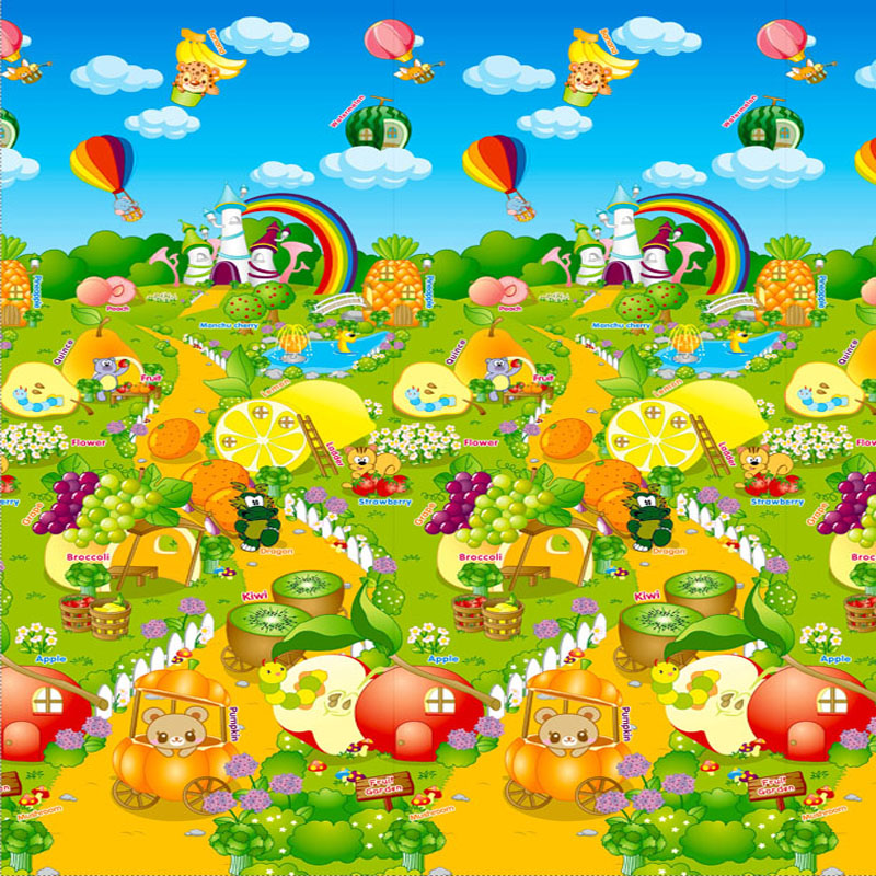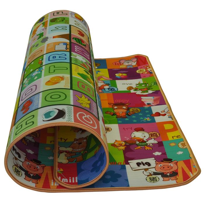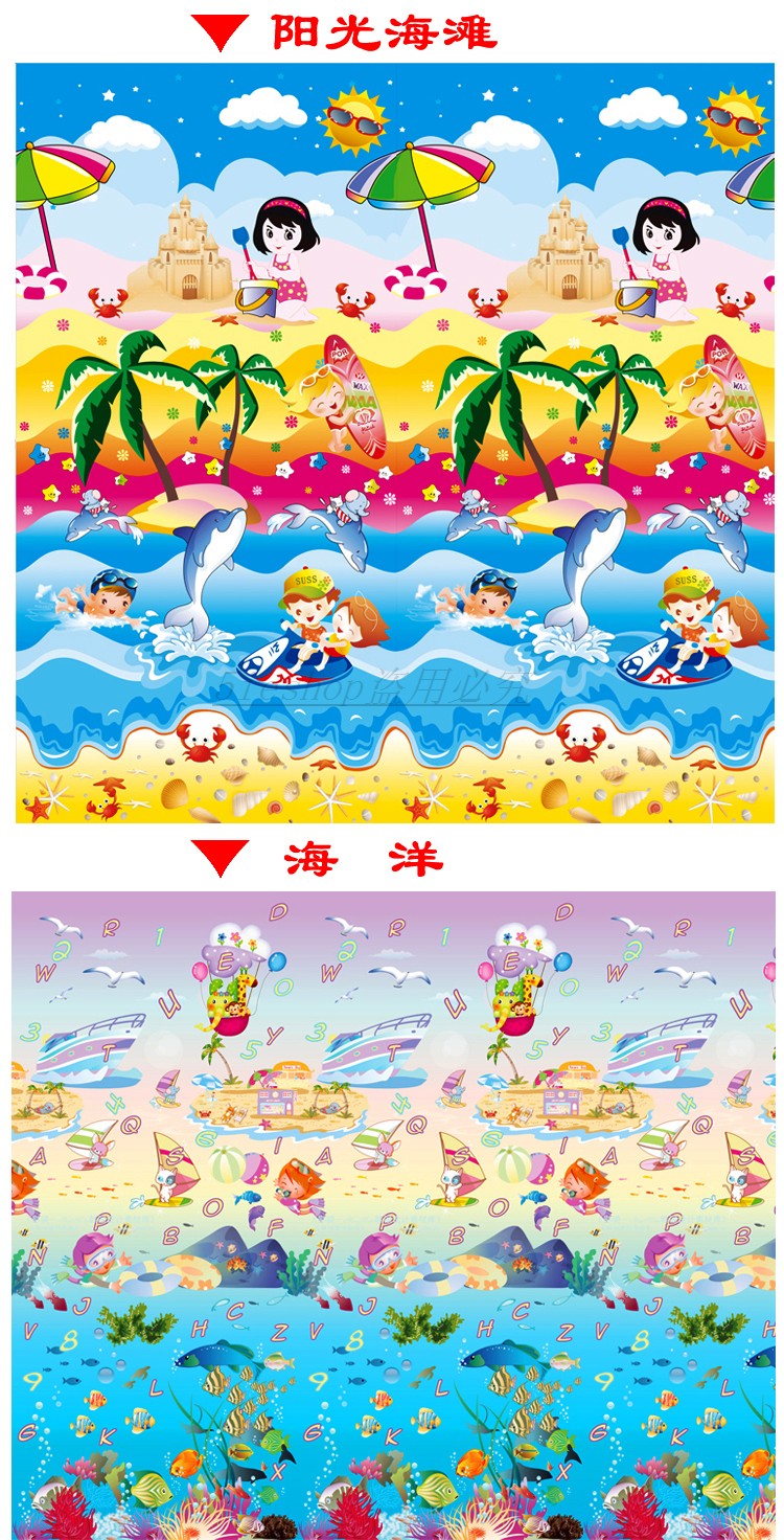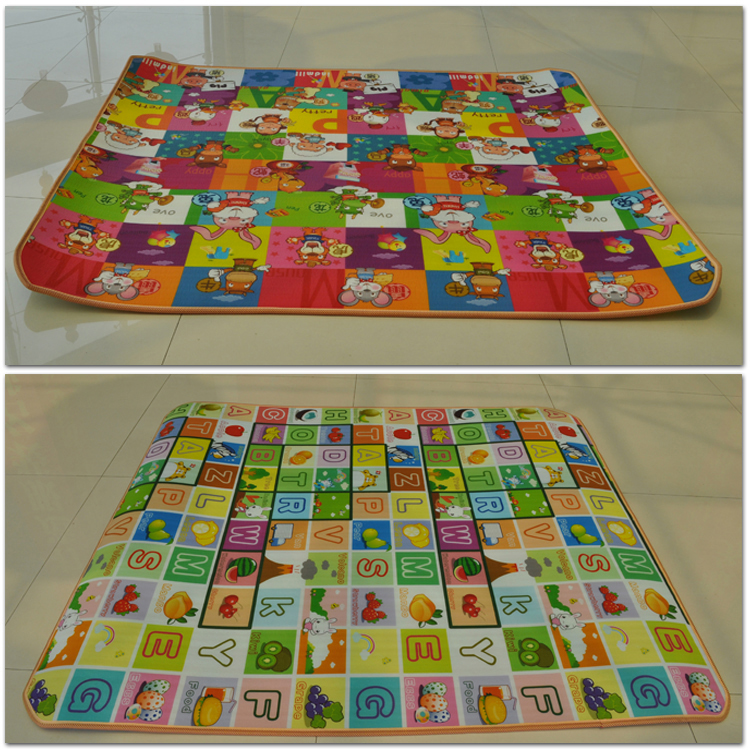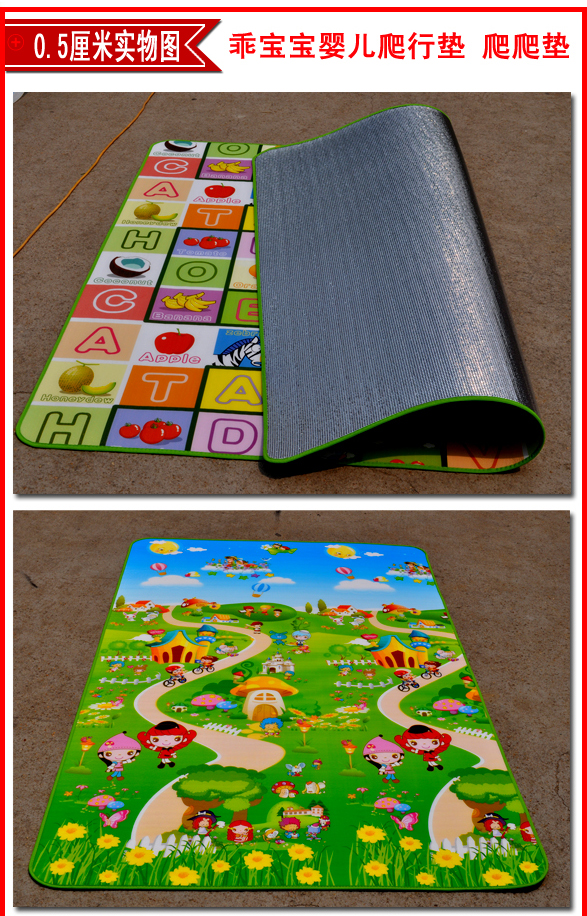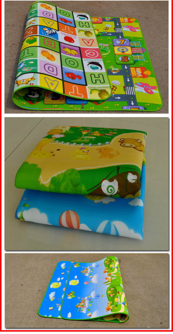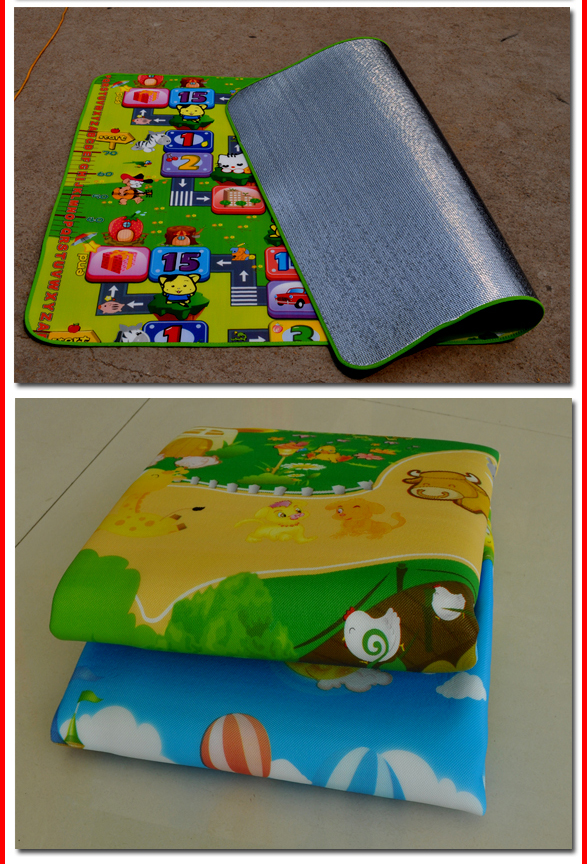 双面是表层:保鲜膜(一种环保彩膜,用于图案印刷富有寓意的卡通图案及凹凸麻纹质感防滑、不起层(即使小宝宝光PP坐在上面也不会粘皮肤)。中间层:用EPE泡棉(双层)、加厚材料隔温隔潮,(珍珠发泡棉,一种无味环保材料,常用于   食品包装)