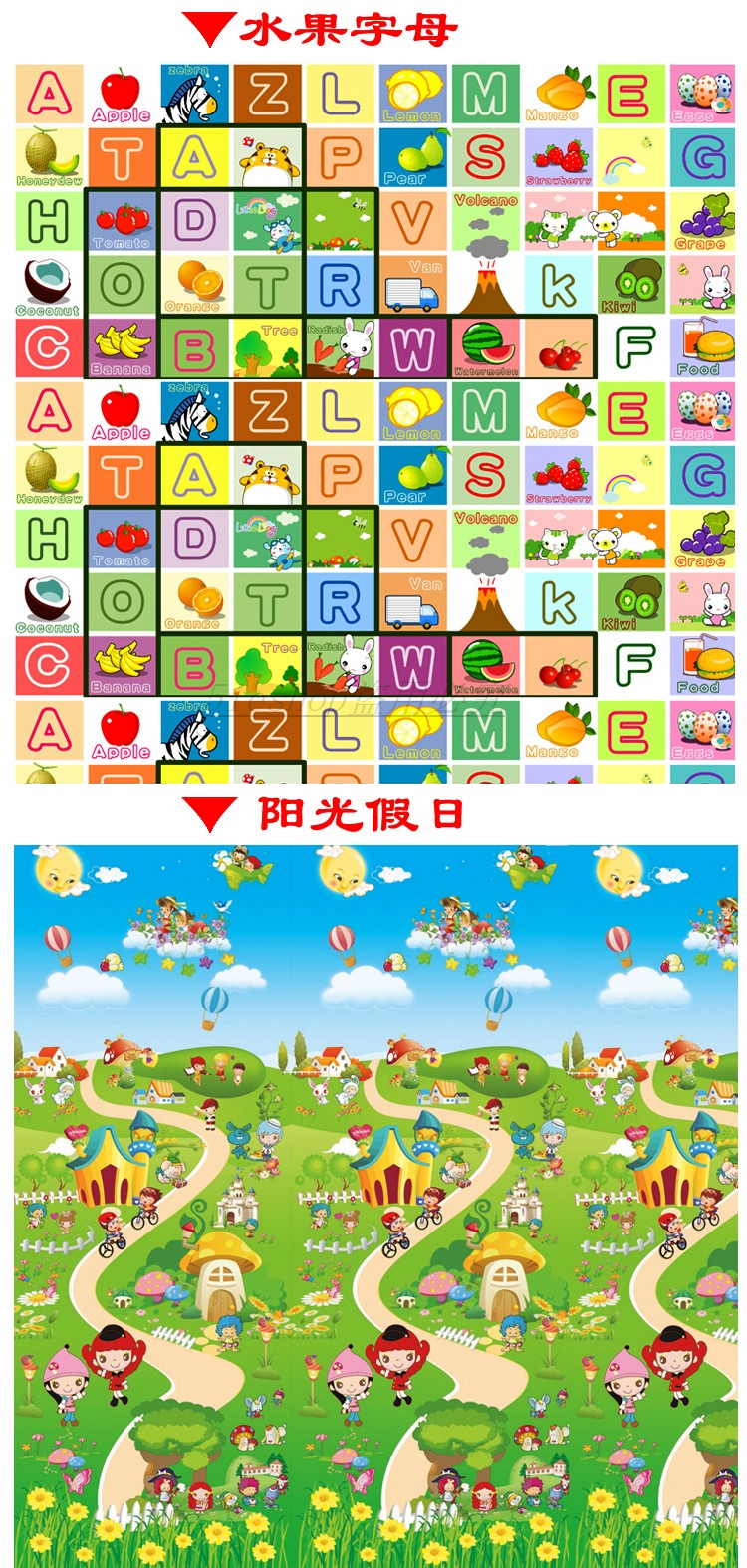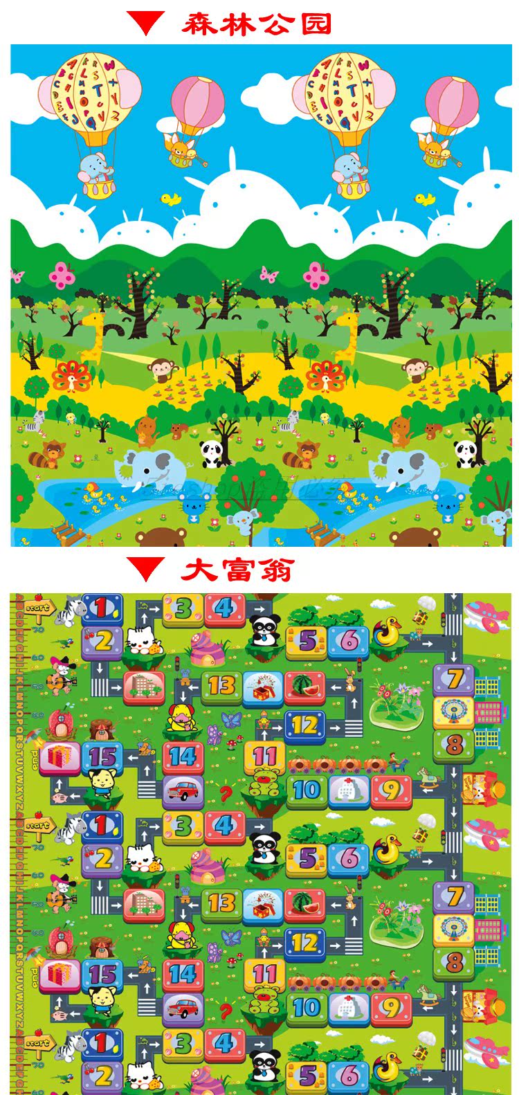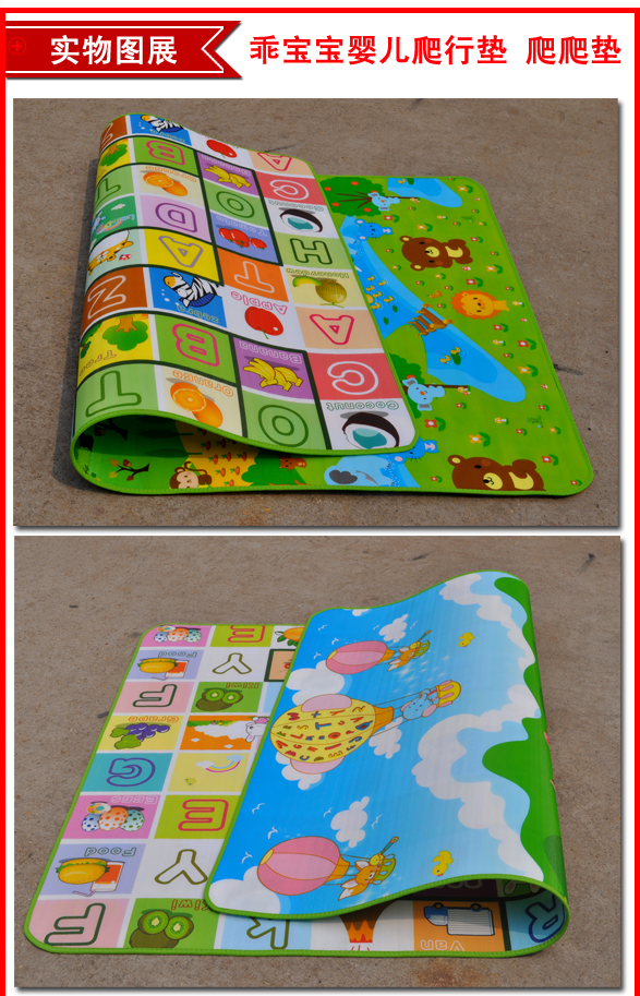 乖宝宝婴儿爬行垫采用环保材料PE+保鲜膜,无毒无味对人体无害,图案设计,卡通图案是在透明材料后进行印刷,宝宝接触不到。