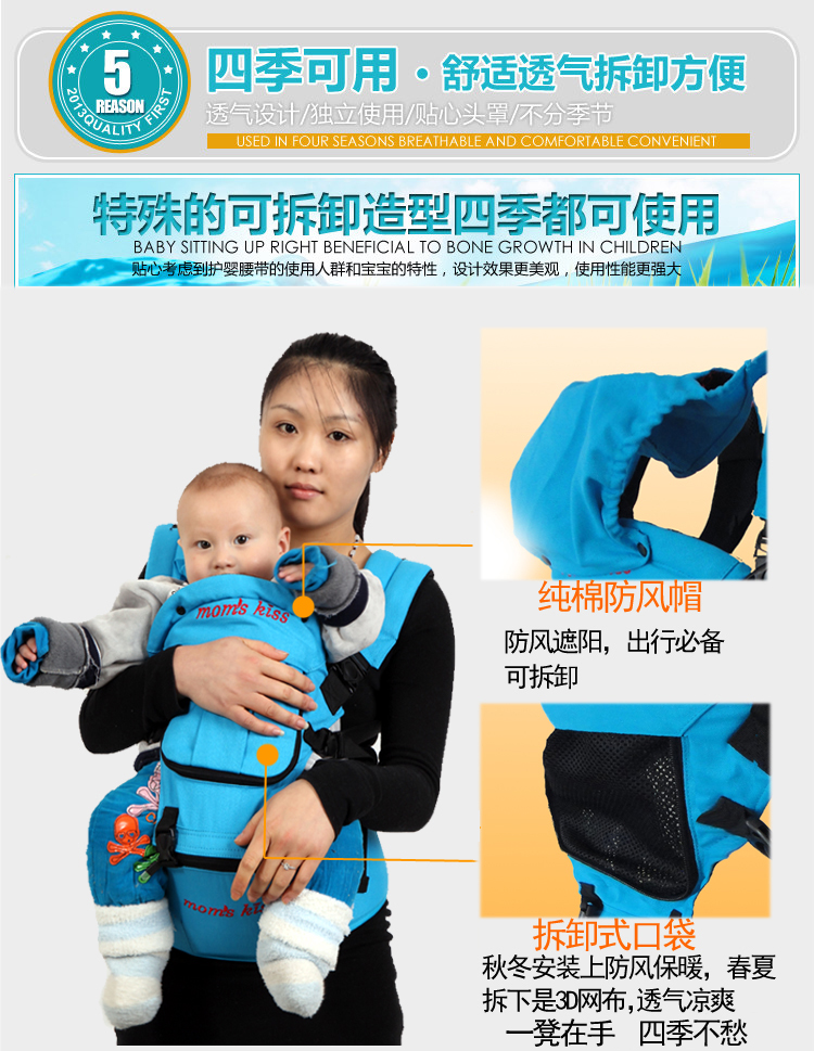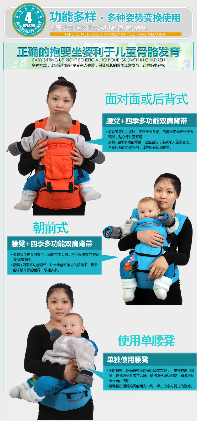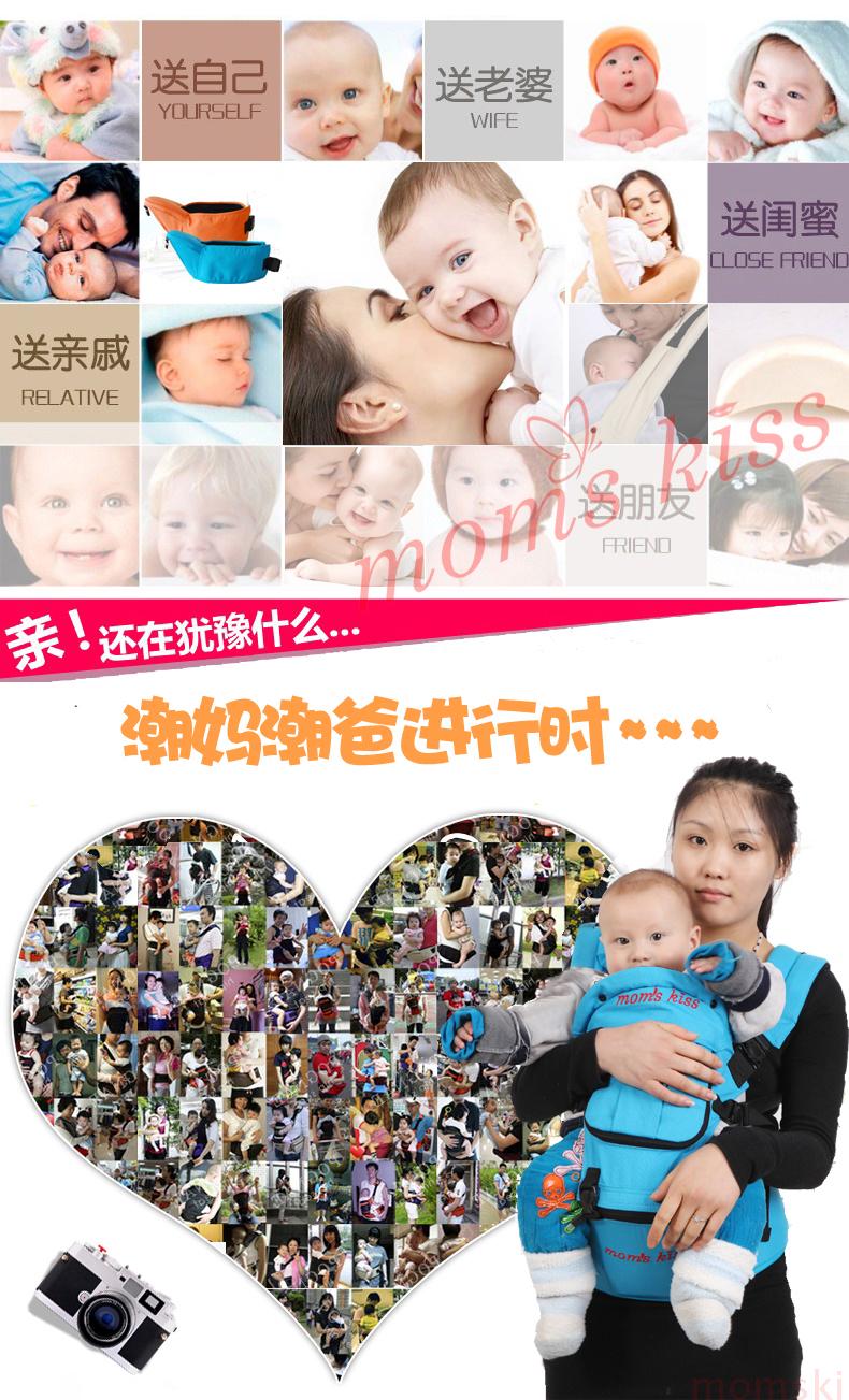 momskiss双肩韩式腰凳,30度斜角,背带可拆卸,腰凳单独使用,拆卸方便,最大承重25公斤。纯棉材质,环保透气,呵护宝宝点点滴。