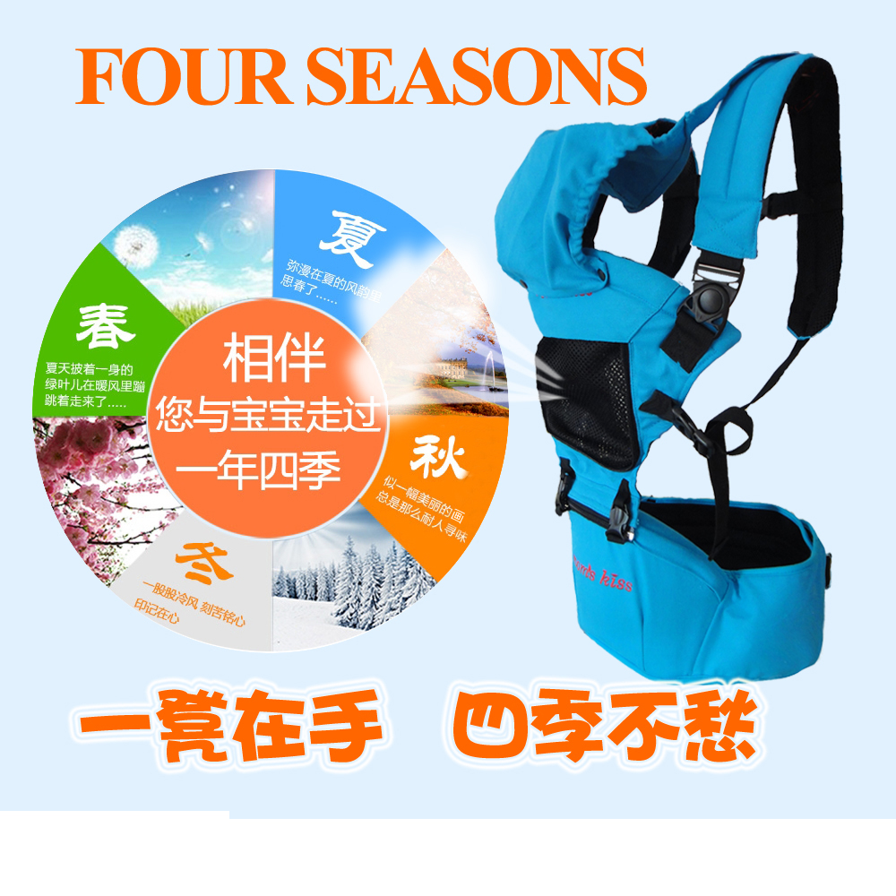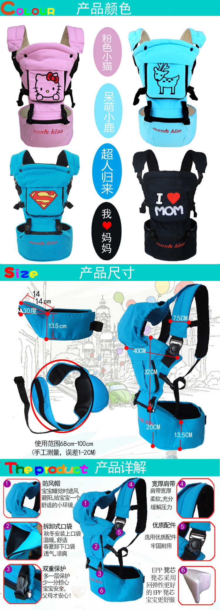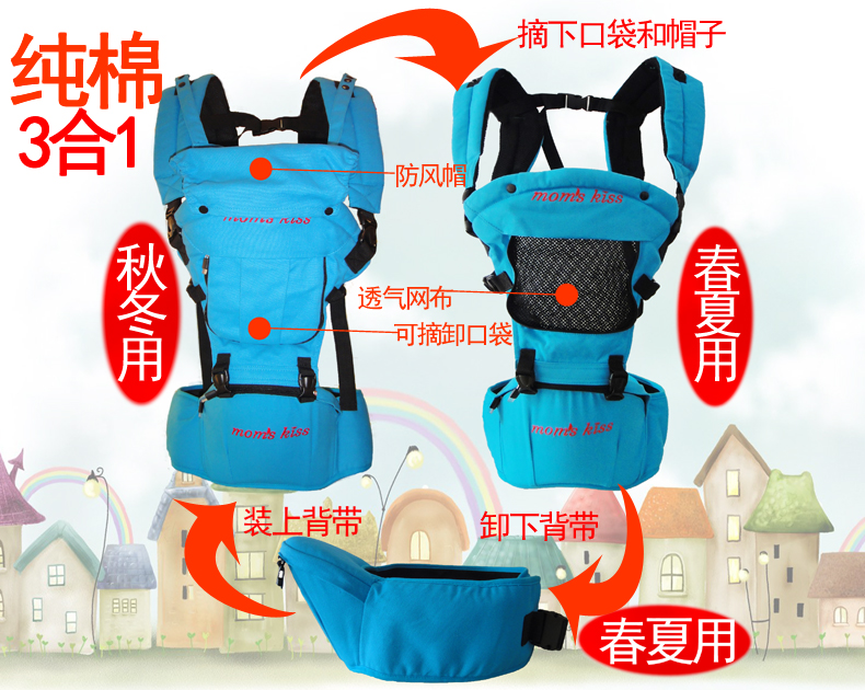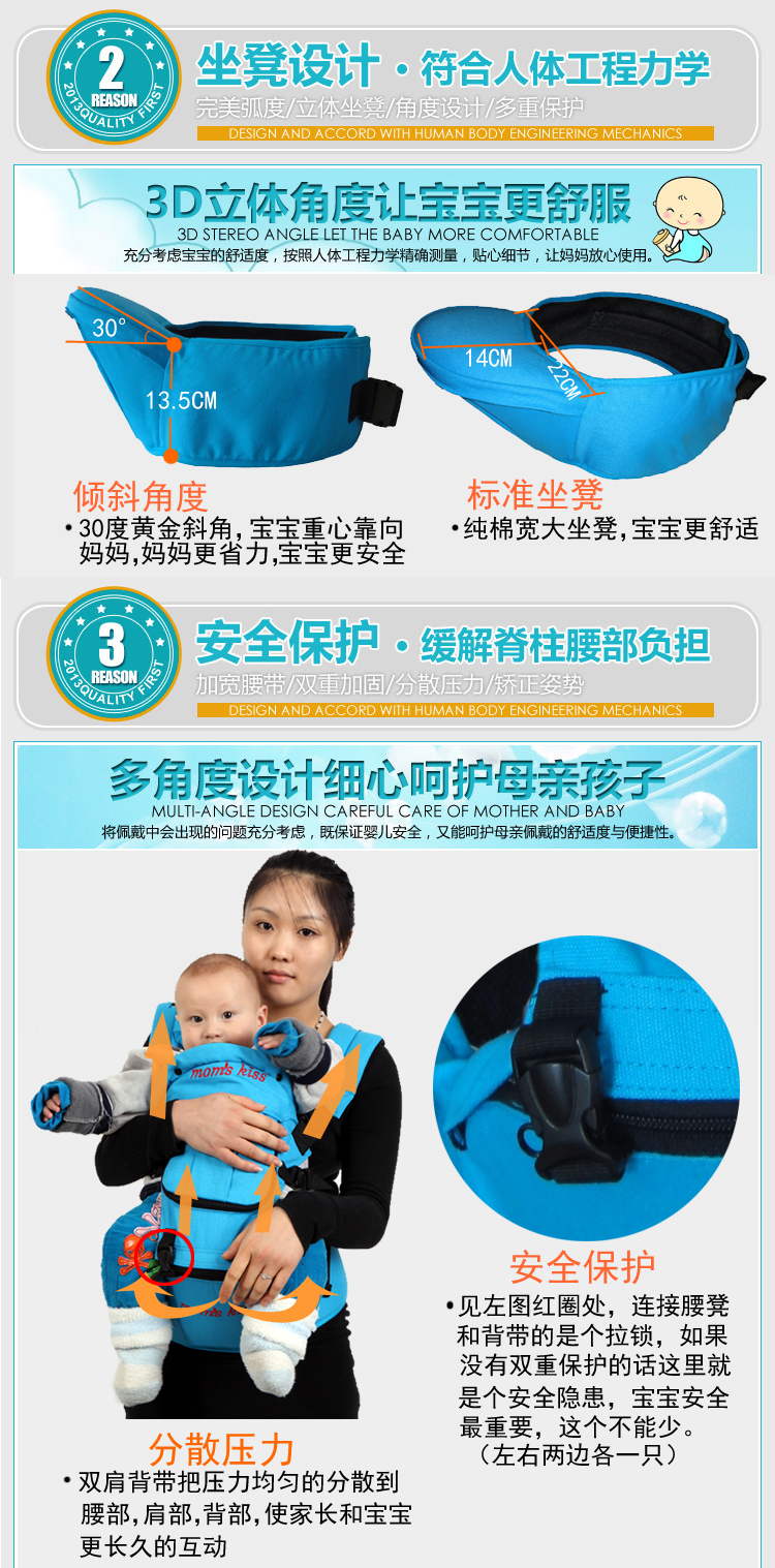 momskiss双肩韩式腰凳,30度斜角,背带可拆卸,腰凳单独使用,拆卸方便,最大承重25公斤。纯棉材质,环保透气,呵护宝宝点点滴。