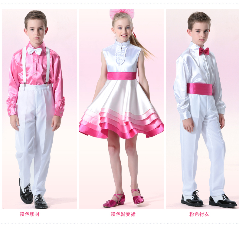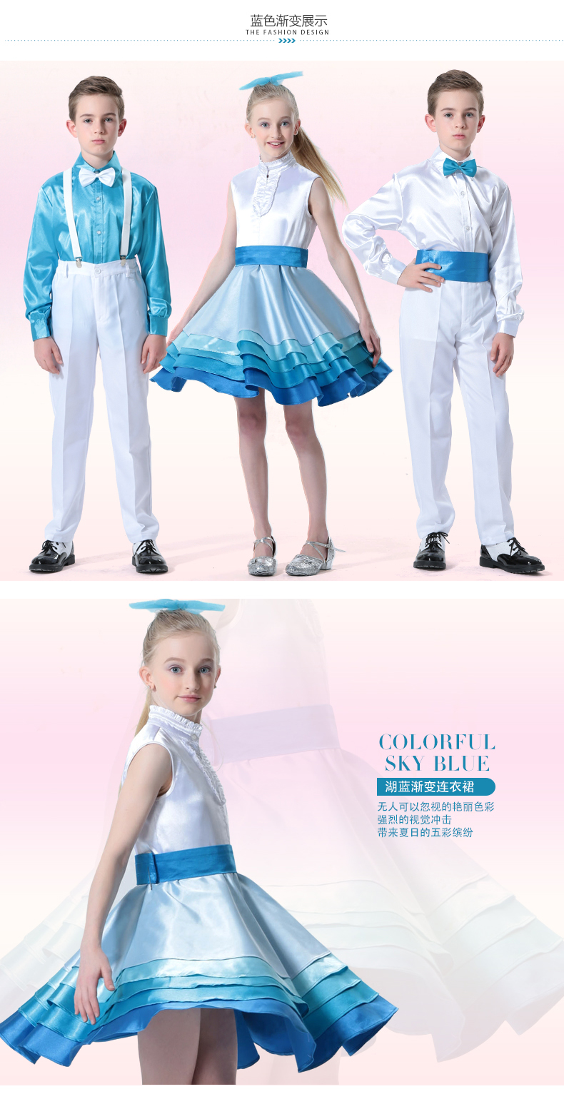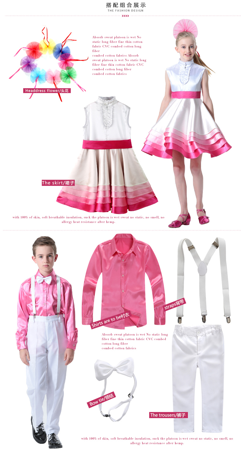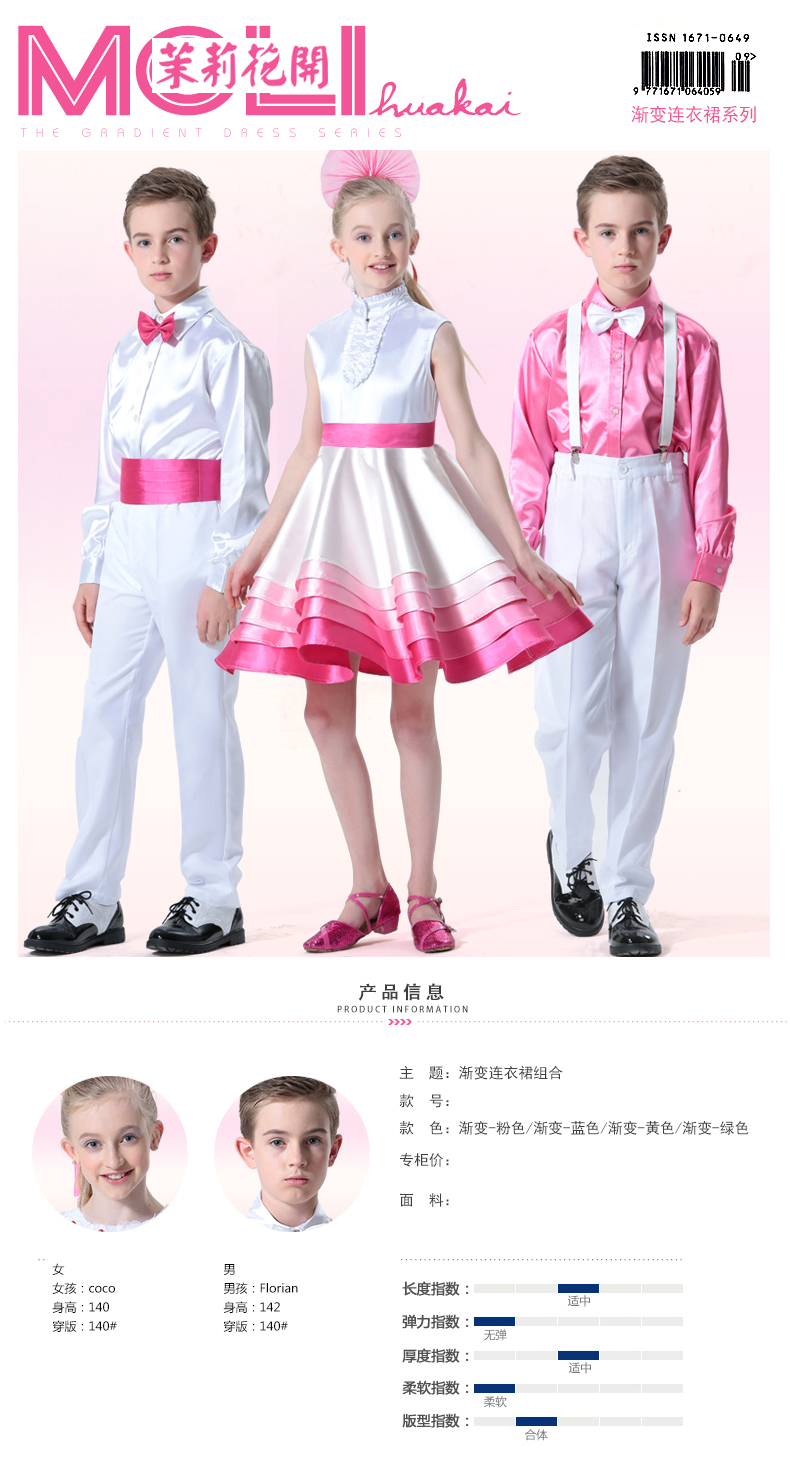 品牌:茉莉花开 安全等级:B类 材质成分:粘胶纤维(粘纤)100% 面料:其他 颜色分类:女孩(渐变粉连衣裙+头花) 男(白衬衣+腰封+白裤+领结) 女孩(渐变蓝连衣裙+头花) 男(白衬衣+腰封+白裤+领结) 男粉衬衣+白裤+黑领结+黑背带 男蓝衬衣+白裤+黑背带+红领带 女-渐...