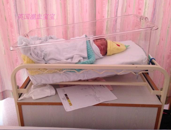 在医院宝宝都要放在这样的小床里(是一个大的透明的长方形的盆子里,下面是小床垫)。小床下面是个柜子,可以放一些宝宝用品。四角有轮子,可以方便的推动。