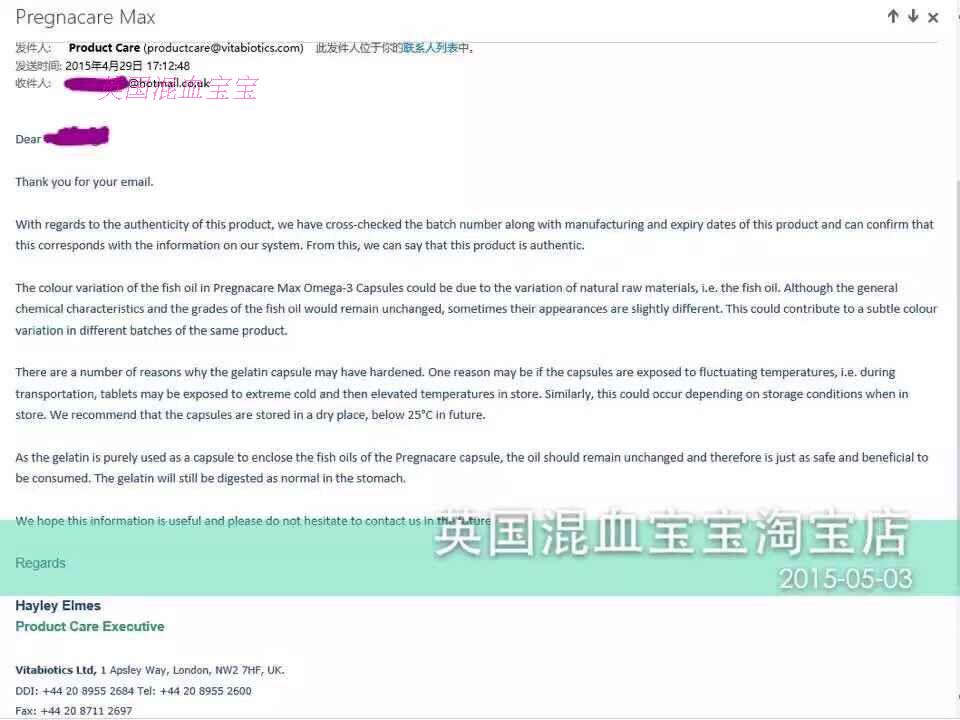 如果您对产品有任何质疑或疑问,可与英国厂家直接联系。请进入英国厂家官网咨询产品,最简单的办法可以给英国厂家发邮件咨询。通常我也是通过邮件方式与他们联系的。比如关于鱼油颜色深浅问题,我早在2013年就和英国厂家确认过,打开官网链接http://www.vitabiotics.com/contact/,然后点击Product Query,进入到下一个页面,按照厂家提供的表格填写,发送表格后请耐心等待厂家回复。关于鱼油颜色深浅请参考下面厂家邮件: