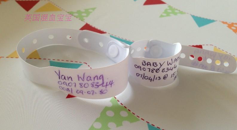 Peter现在12周大了,现在想想仿佛就像昨天一样。记得临近预产期的那些日子里,每天就是时刻准备着拿着待产包去医院分娩。去医院的当天,医生给我戴上写下我名字,出生日期以及编号的塑料环(左边),这个在医院期间得一直带在手腕上。右边的是Peter出生后标有Peter出生日期及编号的塑料环,Peter的是在2个脚踝上各套一个。Peter的塑料环上并没有他的名字,都是Baby +妈妈的姓氏。所以Peter的塑料环上就是 Baby Wang。