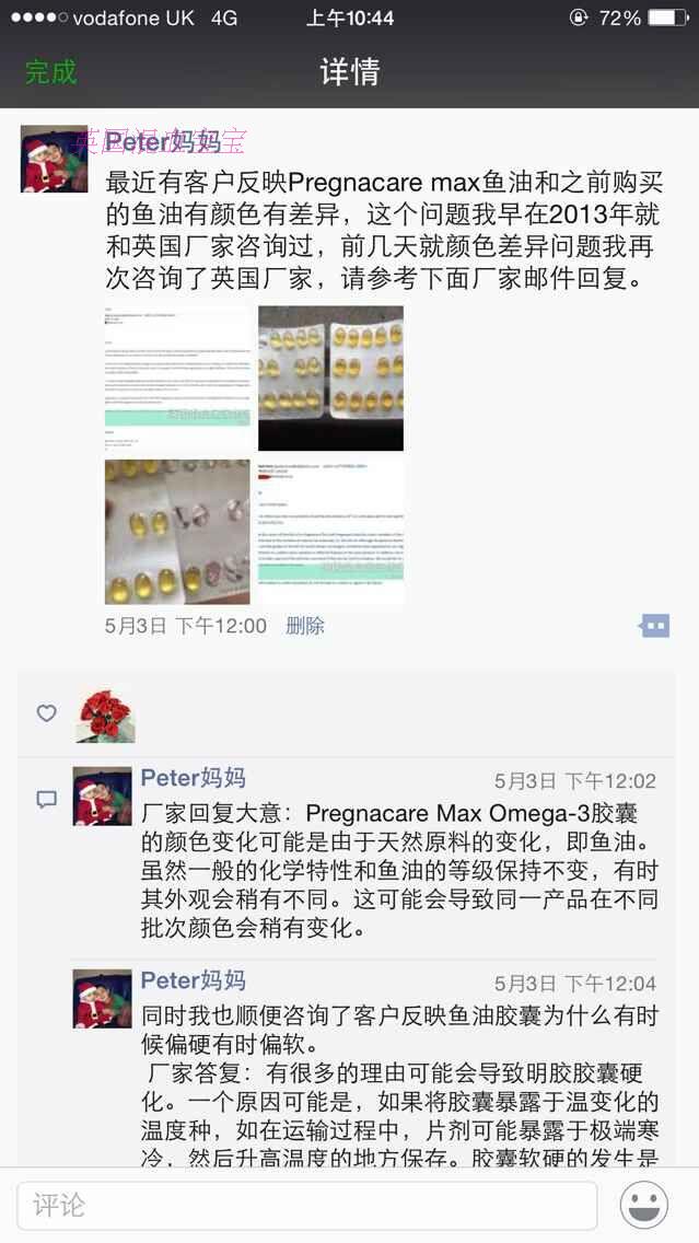 英国店主我于2013年4月7日在英国的 RAH (Royal Alexander Hospital)生下了二宝儿Peter。我在备孕,孕期及产后服用的都是Vitabiotics厂家的Pregnacare复合维生素。Pregnacare 营养成分全面,在孕期和产后给宝宝提供了全面的营养补充。