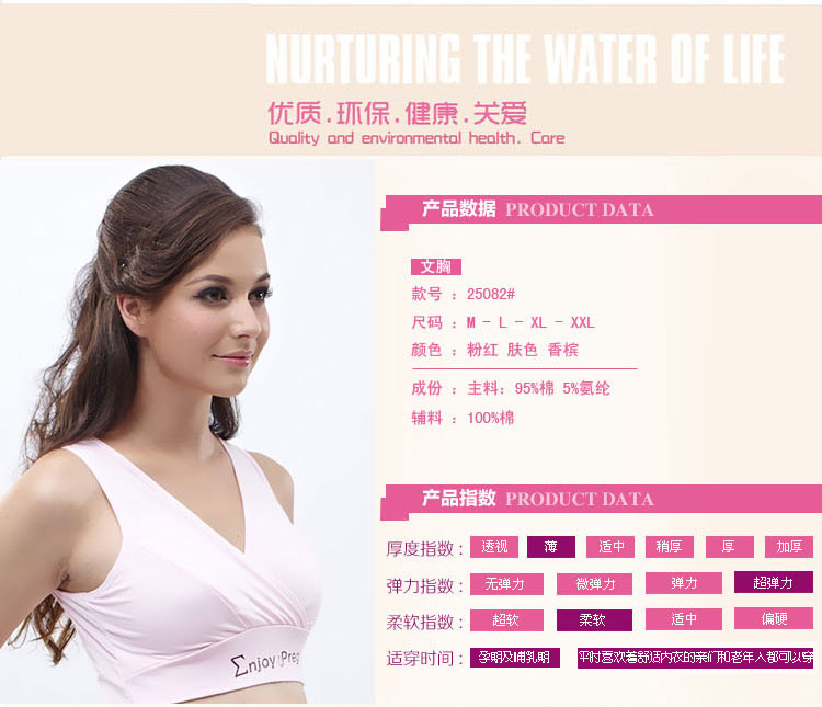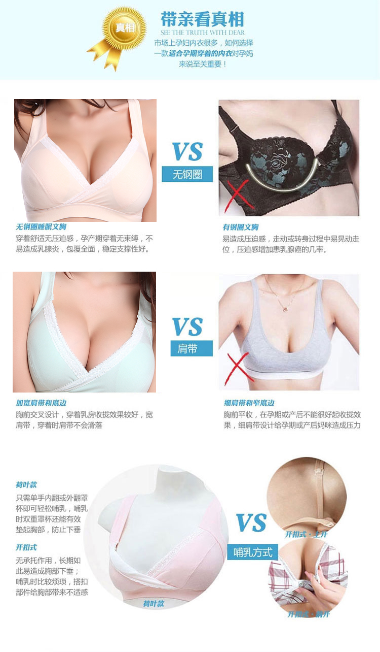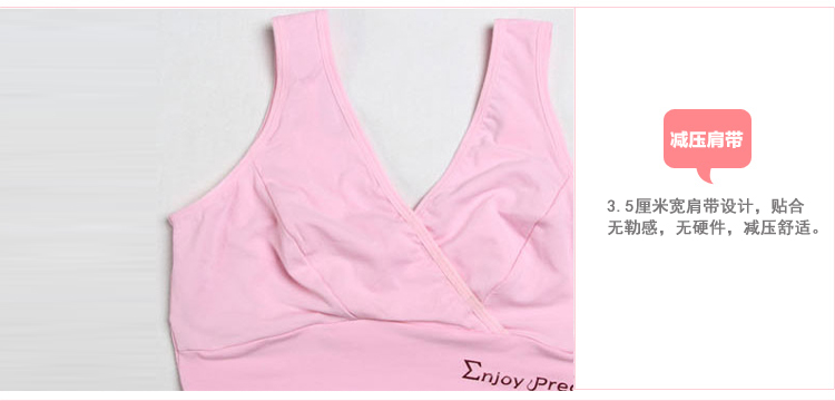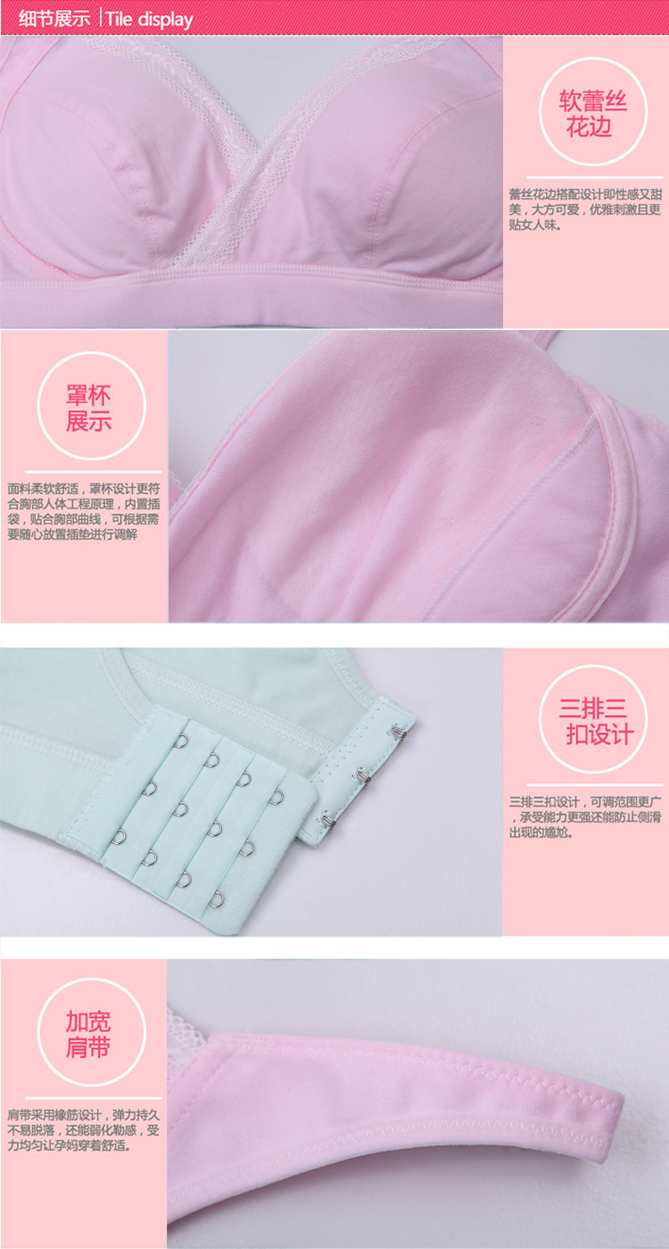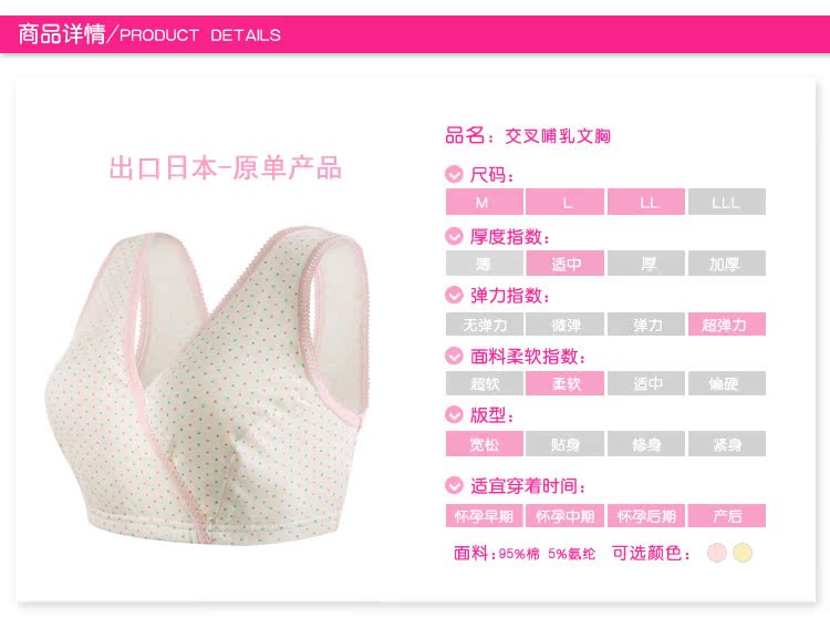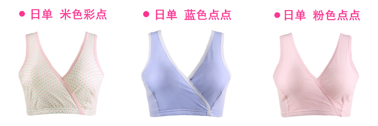 此款面料柔软,全包裹 ,穿着舒适透气,睡觉也能穿,弹性大,喂奶方便,交叉处直接拉开即可,颜色漂亮养眼,这样一款哺乳文胸,无疑是孕期及哺乳期的首选!