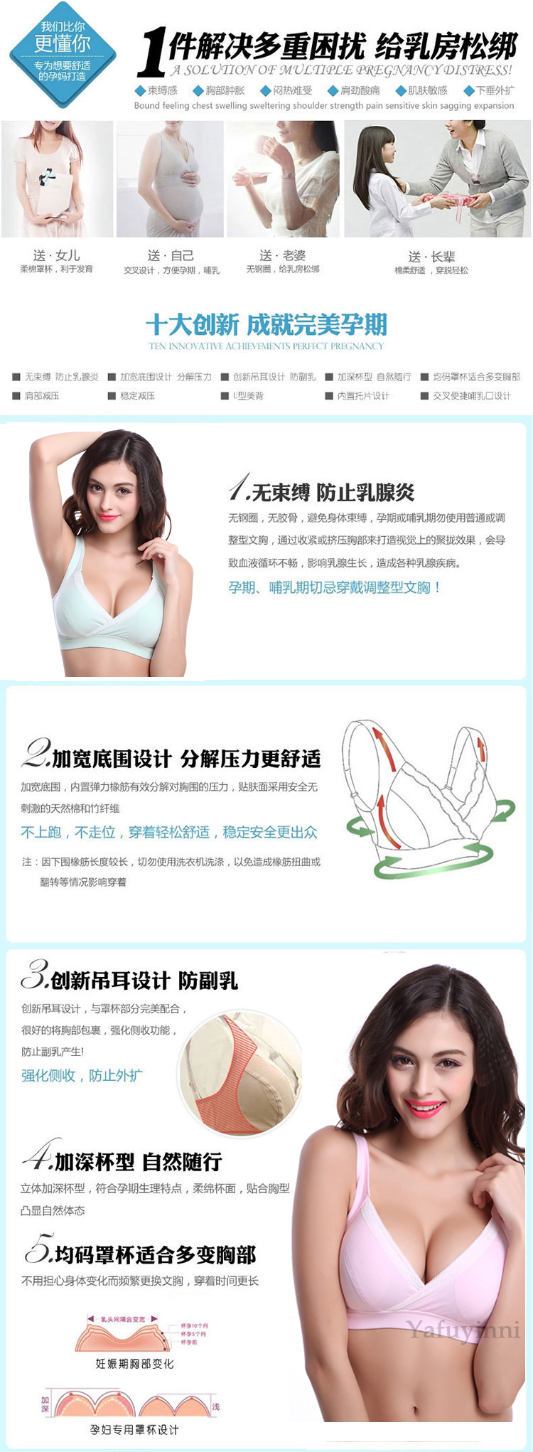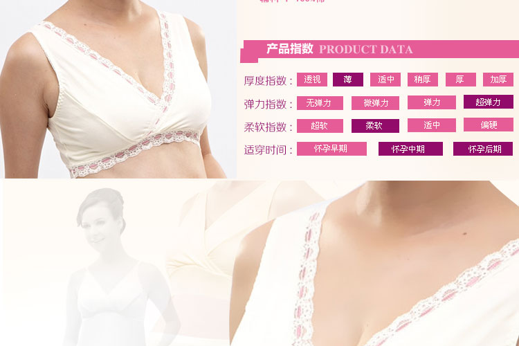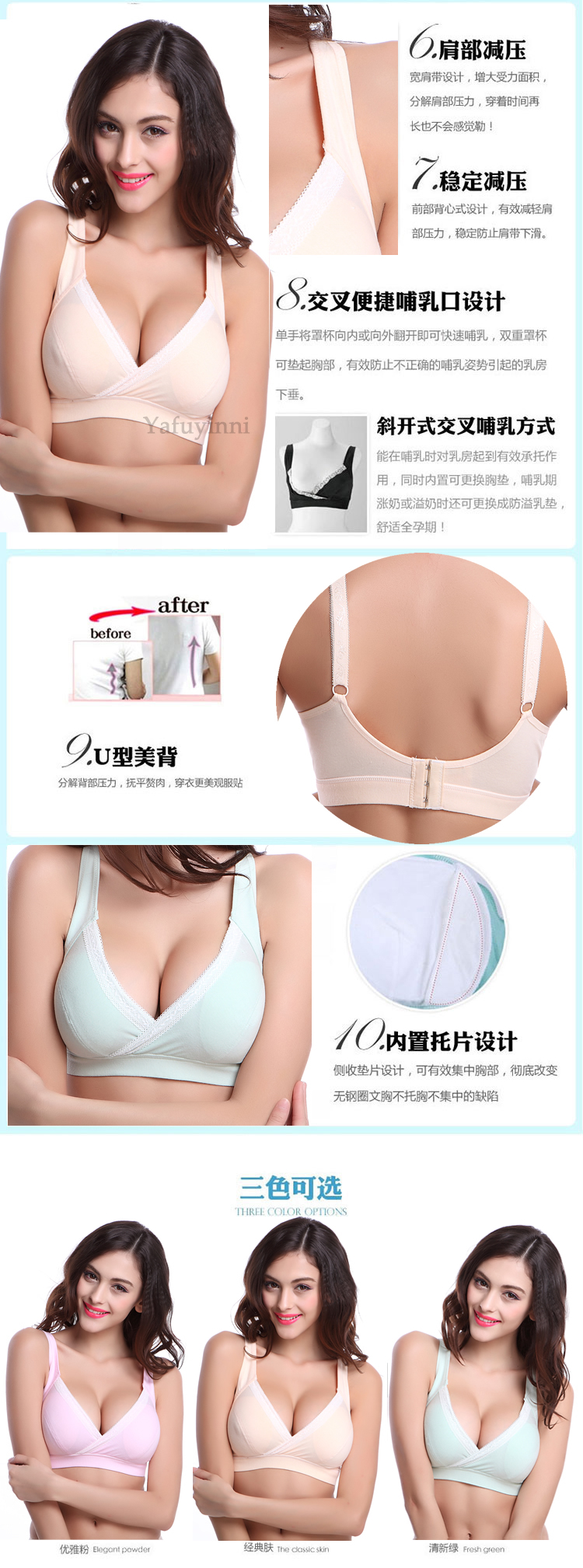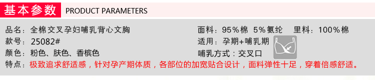 此款面料柔软,全包裹 ,穿着舒适透气,睡觉也能穿,弹性大,喂奶方便,交叉处直接拉开即可,颜色漂亮养眼,这样一款哺乳文胸,无疑是孕期及哺乳期的首选!